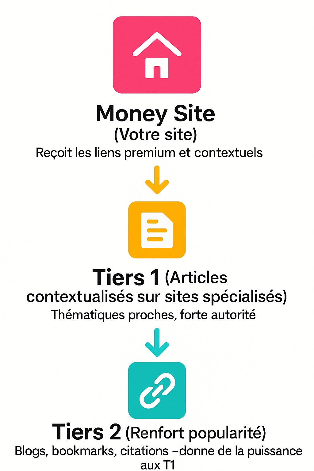 Notre stratégie de netlinking repose sur une structure pyramidale qui sécurise vos résultats SEO. Votre Site reçoit uniquement des backlinks premium et contextualisés, directement intégrés dans des articles de qualité (Tiers 1). Ces contenus sont ensuite renforcés par un second niveau (Tiers 2) composé de liens complémentaires – blogs, bookmarks, citations – qui donnent davantage de puissance aux T1..